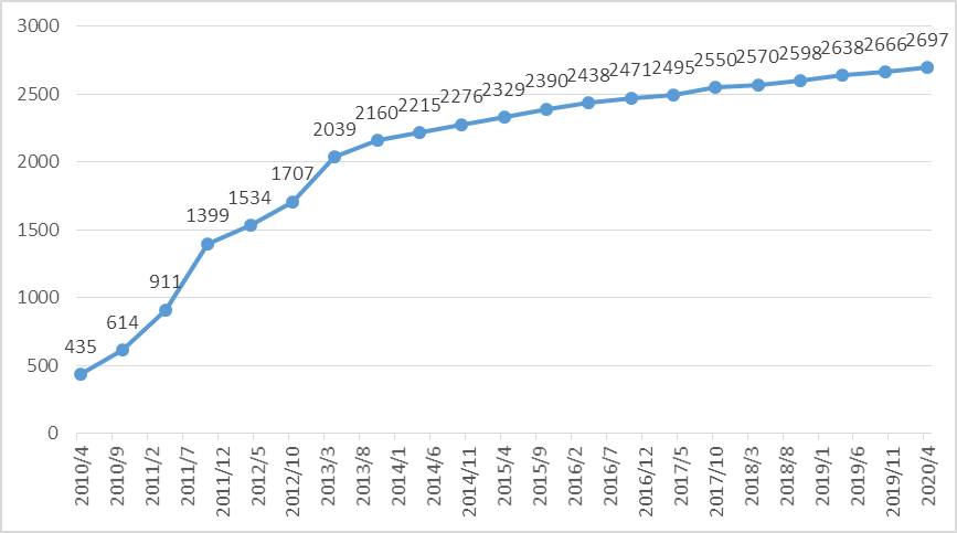据全球IPv6论坛IPv6 Enabled WWW Logo认证项目统计,截止到2020年6月,全球已有2697个网站顺利获得IPv6 Enabled WWW Logo测试并取得认证。以下是IPv6 Enabled WWW Logo项目给予的累年总体统计数据,如图9。IPv6 Enabled认证的网站按国家/地区分布统计如图10,IPv6 Enabled Logo按网站类型统计如图11。